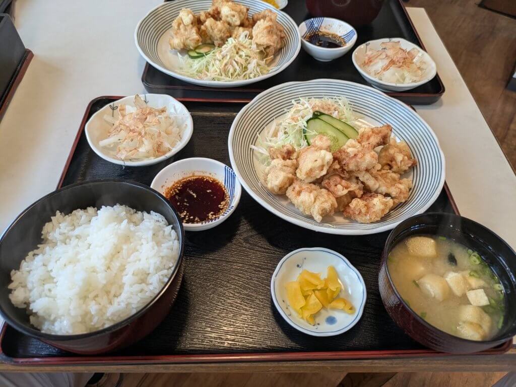 看板メニューはとり天定食。衣はサクサク、中はふわっとジューシーな鶏肉が絶妙。タレにつけると旨味が一層引き立ちます。メニューは「とり天定食」と「日替わり定食」のみという潔さ。
