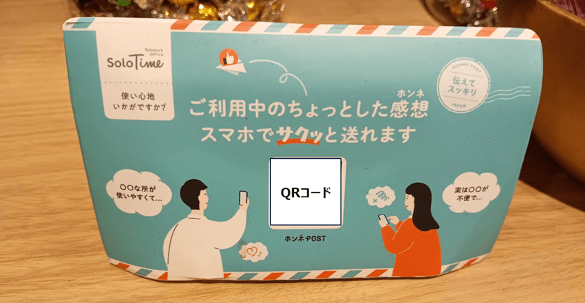 SoloTime会員の皆さまは、SoloTime公式HPやお電話等で、お気づきの点やお困りの点等をいつでもご連絡いただけますが、さらに気軽にお伝えていただけるように、LINEから匿名で簡単に感想を送れるデジタル手紙サービスの「ホンネPOST」を一部店舗にて導入しています。「ここが気になった」「こうだったらもっと使いやすい」といった率直なお声は勿論、「わざわざ伝えるほどの内容ではないかもしれないけど・・・」という皆様の“本音“も受け止め、店舗サービスの改善のヒントとして活用させていただいております。
