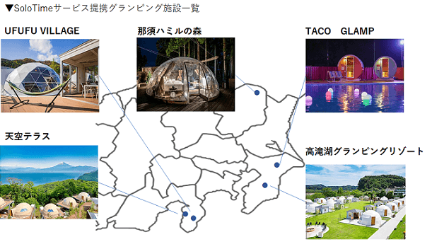 また、SoloTimeは株式会社HAMIRU様他(※)が運営されるグランピング施設と提携しており、Solotime会員であればHAMIRU&UFUFUリゾートが運営するグランピング・ホテルをいつでも特別割引価格(公式ホームページのベストレート保証価格から更に10%OFF)にてご利用いただけます。