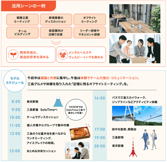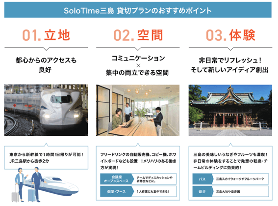 是非、チームでのディスカッションや研修、ワーケーション等でSoloTime三島をご活用ください。