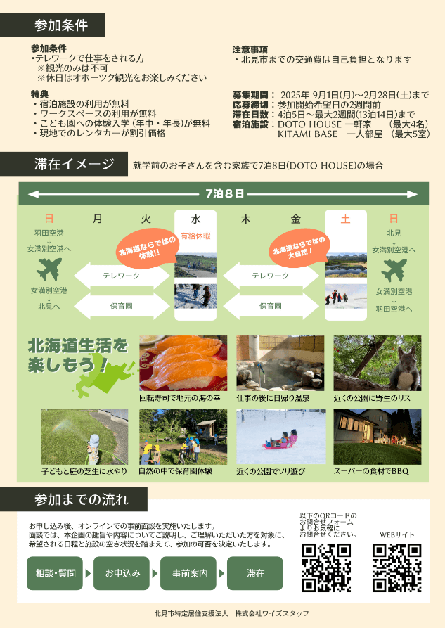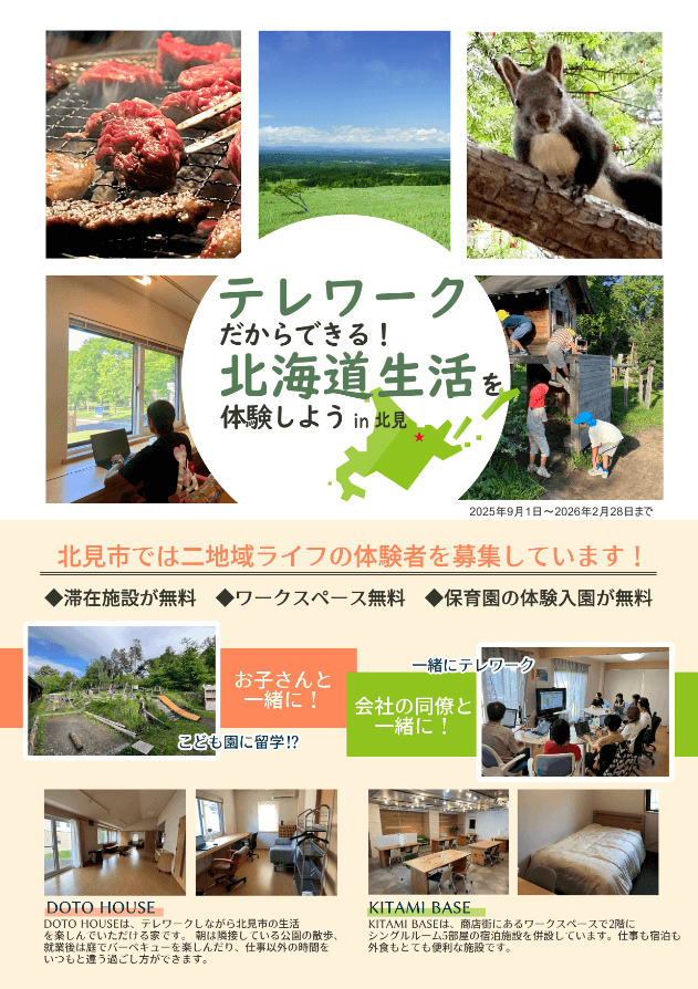 「テレワークだからできる!北海道生活を体験しよう!in 北見」専用サイトでは、参加条件・滞在中の宿泊施設やワークスペースの詳細・参加者体験記などを掲載しています。